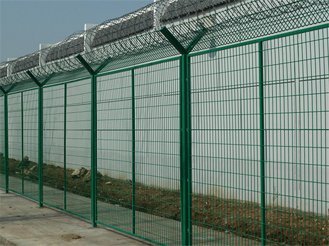 防攀爬防護(hù)欄網(wǎng)多用于監(jiān)獄,起到一個防攀爬,防犯人越獄的效果,他可以用普通的護(hù)欄網(wǎng)片,柱選“Y”型立柱,在頂端放置刀片刺繩,也有選擇網(wǎng)片是太陽花式的,還有選擇刺繩做的。