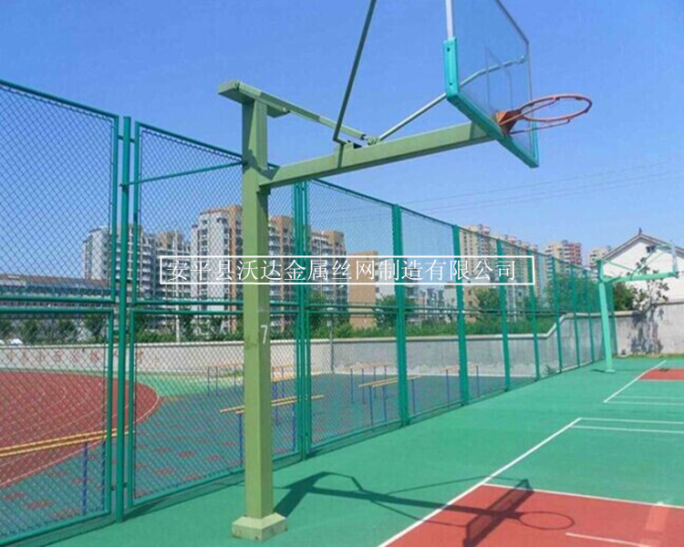 體育場圍網固定立柱,現場施工提供膨脹螺絲固定法蘭盤,或現場施工澆筑水泥預埋立柱連接立柱和橫梁,通過抱卡連接,抱卡樣式分拐角專用、邊柱專用、雙向連接專用,抱卡連接立柱和橫梁分別搭配不同長度的圓帽方根的螺絲進行固定,螺絲配件隨成品一起發貨。橫梁固定好之后,穿成相應大小的勾花網片,四周穿8mm的鋼筋,靠鋼筋與u型卡的拉力拉平圍網并固定。表面修復處理,噴漆或噴水,保證表面整潔。